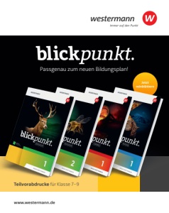 Überarbeitete Fachpläne in den Fächern Biologie, Chemie und Physik zum Schuljahr 2026/2027 Die Auflösung des Fächerverbunds BNT führt zu Verschiebungen im Bereich der inhaltsbezogenen Kompetenzen in den Fächern Biologie, Chemie und Physik. Seit dem Schuljahr 2025/2026 ist Biologie Pflichtfach ab Klasse 5/6. Mit Blickpunkt Biologie 1 sind Sie bestens gerüstet. Der Band für Klasse 5/6 ist zugelassen und lieferbar. Blickpunkt Biologie 2 (Kl. 7–9) ist in Arbeit – blättern Sie hier vorab im Kapitel „Sinne und Wahrnehmung“. Die komplette Blickpunkt-Reihe wird auf die überarbeiteten Fachpläne für die mittleren Schulformen in Baden-Württemberg angepasst. Zum Schuljahr 2026/2027 erhalten Sie auch die neuen passgenauen Ausgaben Blickpunkt Chemie 1 und Blickpunkt Physik 1. Überzeugen Sie sich von der neuen Blickpunkt-Generation für Baden-Württemberg. Gerne präsentieren wir Blickpunkt auch in Ihrer Fachschaft. Kontaktieren Sie uns einfach unter www.westermann.de/schulberatung Alle Blickpunkt-Angebote finden Sie unter www.westermann.de/blickpunkt-familie Bereits zugelassen! Für Klasse 5/6 Für Klasse 7–9